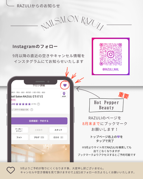 【重要】9月よりホットペッパービューティーのプラン変更に伴いサイト内にて当店を検索しても出てこなくなります。8月中にブックマーク登録をお願いいたします。なおブックマークからのアクセスは引き続きネット予約が可能となります!